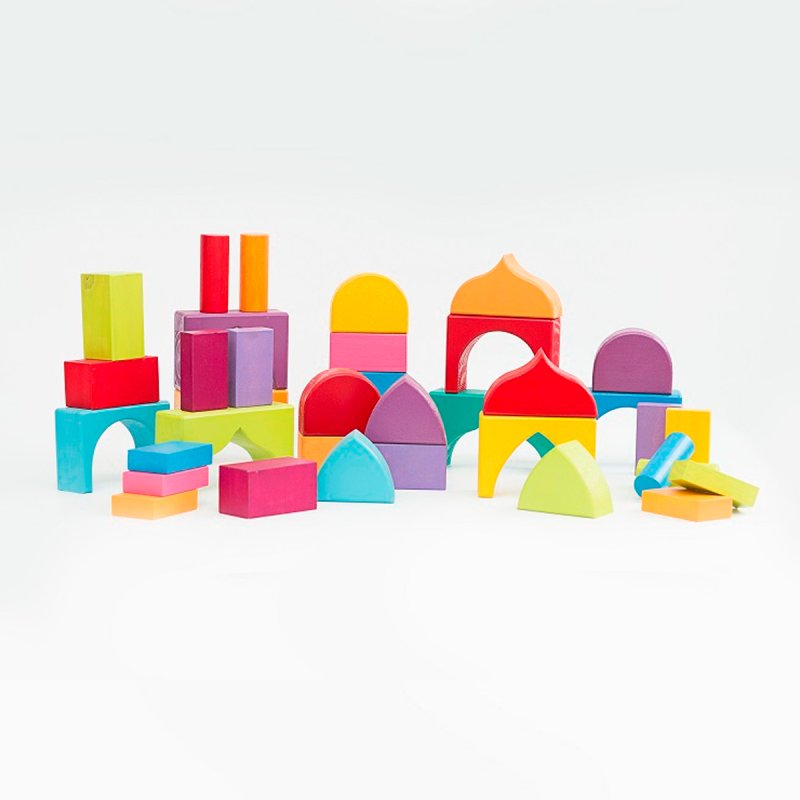 Otro de nuestros  conjuntos para construcción y uno de los juguetes de madera más apreciados por su versatilidad y también por la belleza del material. Son 37 piezas inspiradas en formas orientales, de tamaño grande. Ideal para combinar con los arcos y otros juegos de bloques.