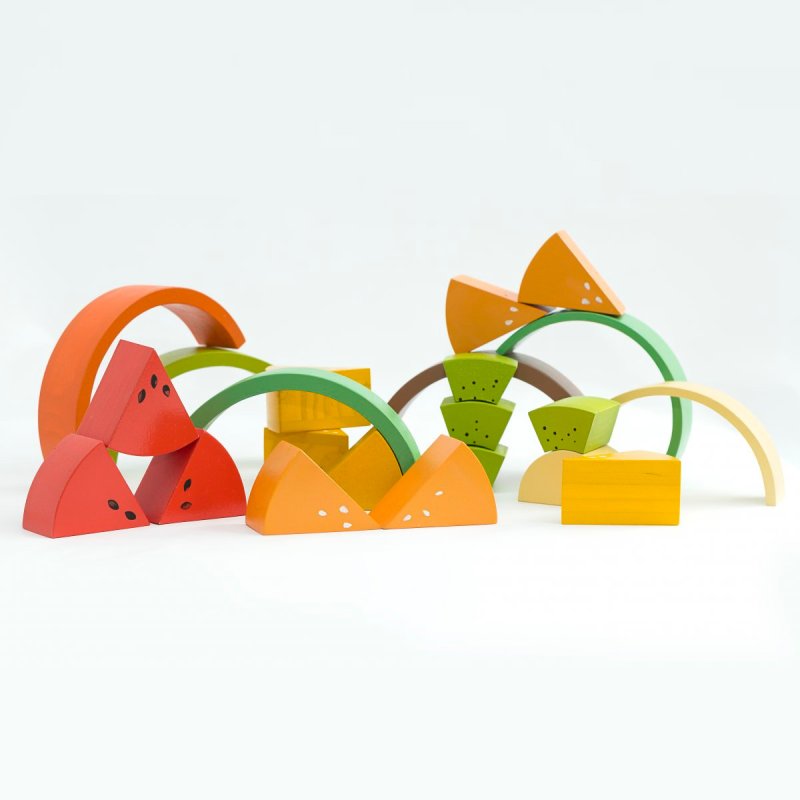 Bloques de construcción con características de frutas, estas ayudaran con la motricidad, distinción de colores, formas, tamañas, pesos.