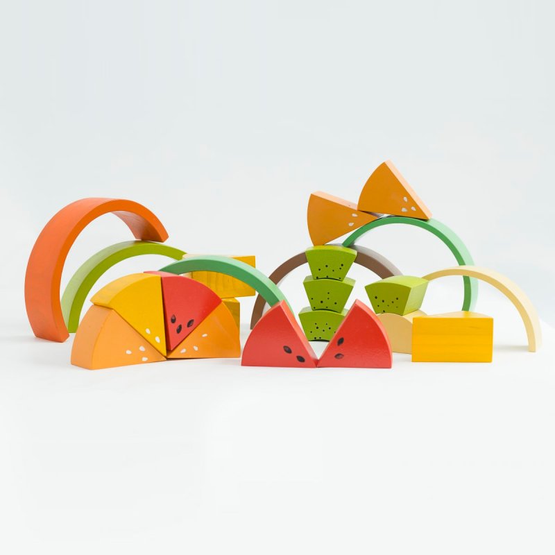 Bloques de construcción con características de frutas, estas ayudaran con la motricidad, distinción de colores, formas, tamañas, pesos.